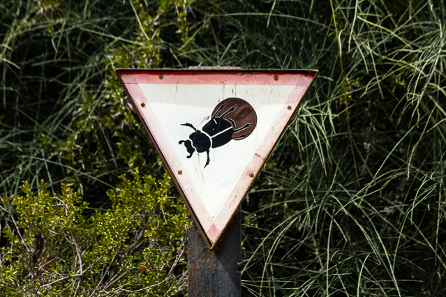 Já sabíamos que esta espécie de insectos andava por ali, pois um original sinal de trânsito alertava logo à entrada do parque para o perigo de os encontrar – ou de os encontrar e de lhes passar com o carro por cima. Pelo que em alguns troços nos dedicámos a uma difícil gincana e à observação do complicado transporte das bolas de estrume executado por estes bichos, menores geralmente do que aquilo que empurram. Mas para que servem estas bolas, perguntar-se-á o visitante? Servem de alimento, de fertilizante dos solos, de incubadoras de ovos e até de aparelho de ar condicionado portátil, respondem os cientistas. Investigadores suecos descobriram em 2012, noticiava na altura o jornal Público, que os escaravelhos sobem mais vezes para a bola quando a temperatura do solo é muito alta.